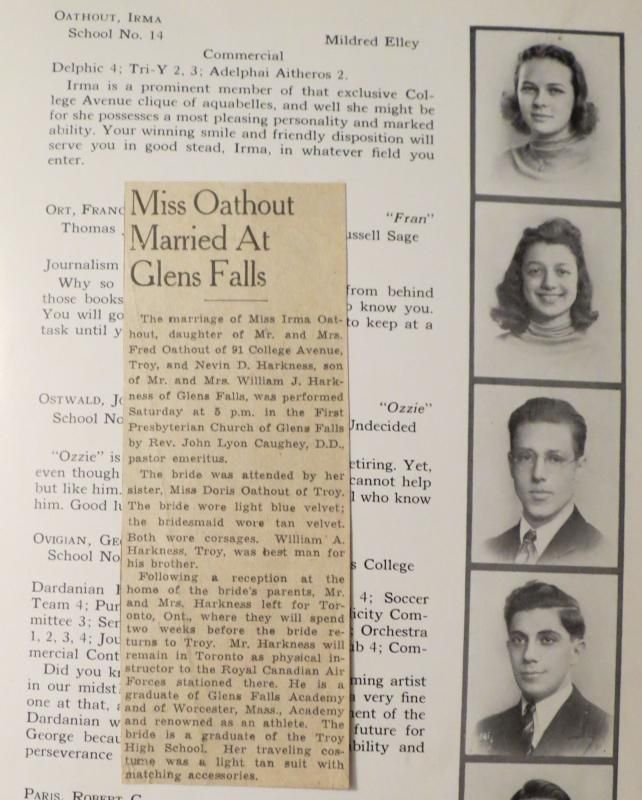 My dear mother-in-law was recently loaned a vintage scrap book, much of which was assembled from newspaper clippings in the 1940s.  Janice, my wife, noticed this yellowed clipping and then we found the yearbook entry that shows the young beauty that captured Ned's heart.