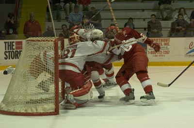 What's wrong with your camera? You know about color correction? The red tones are all over the place. On my paintstakingly color corrected monitor, it appears that the Cornell pants are, like, eight shades more faded and less red than the Cornell jerseys. And it's that way on every picture. It's almost as if the guy wearing the "Lodboa" jersey had to wear the very same pants Lodboa wore in 1970. Sheesh, this is not good advertising for Cornell hockey.